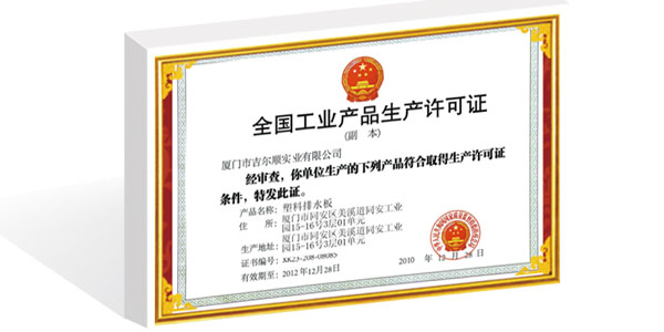 吉爾順實業有限公司獲得《全國工業生產許可證》: