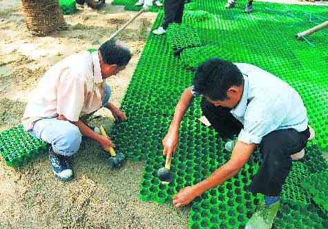 第二種是采用植草格,將植草地域釀成可承重的地域,用于泊車場的泊車位和車道。排水板植草格是采用德國的先輩技術手段由100%高密度聚乙烯再生塑料制成,它是一種可循環應用的環保材料,可抗紫外、抗激烈沖壓。其應用后草坪的籠蓋率達95%,承重伎倆為200噸/m2,同時它經管了植草磚的流弊,可用于干熱地域。